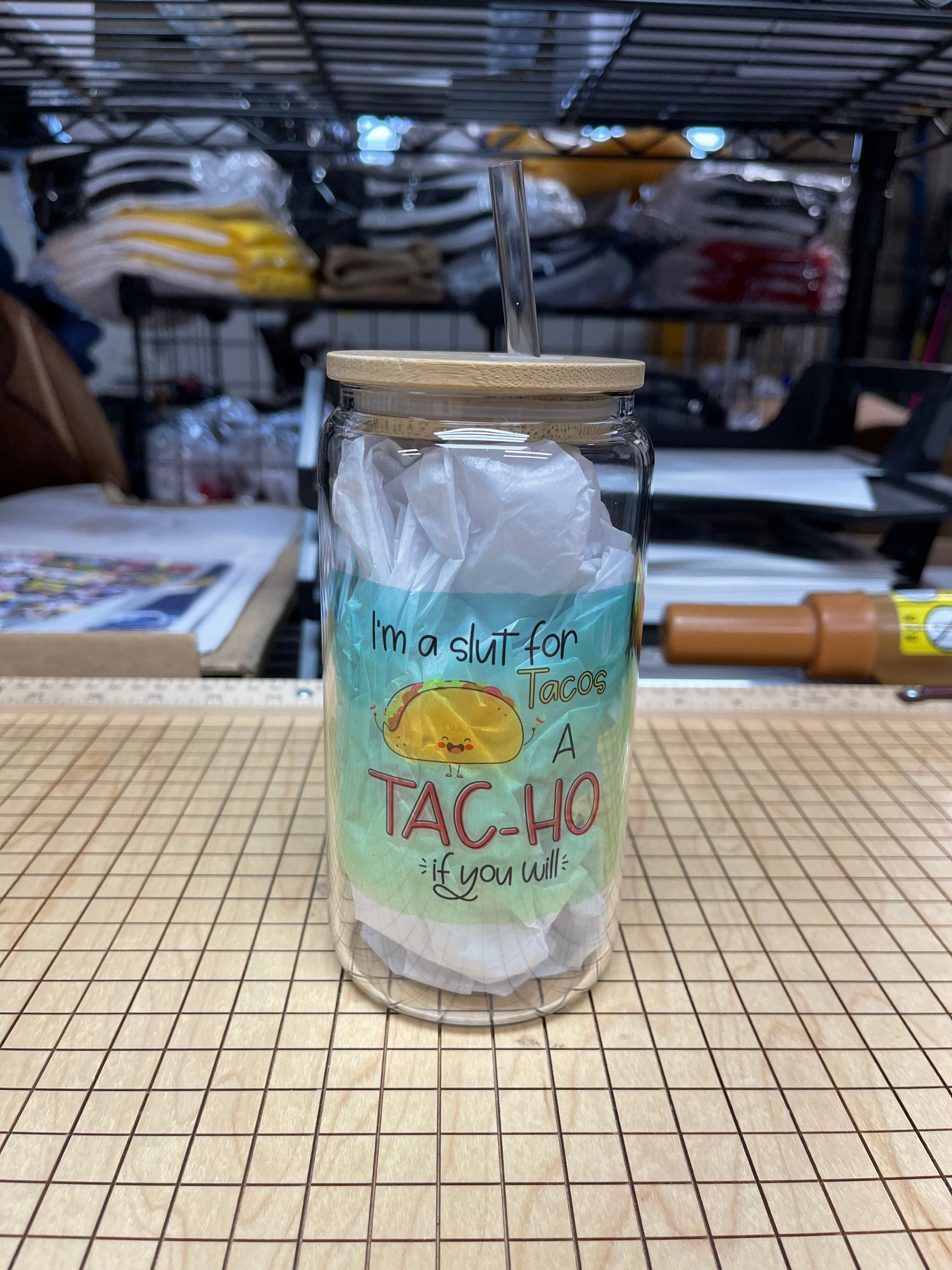 16oz Glass Tac-ho tumbler. With bamboo lid and plastic straw.