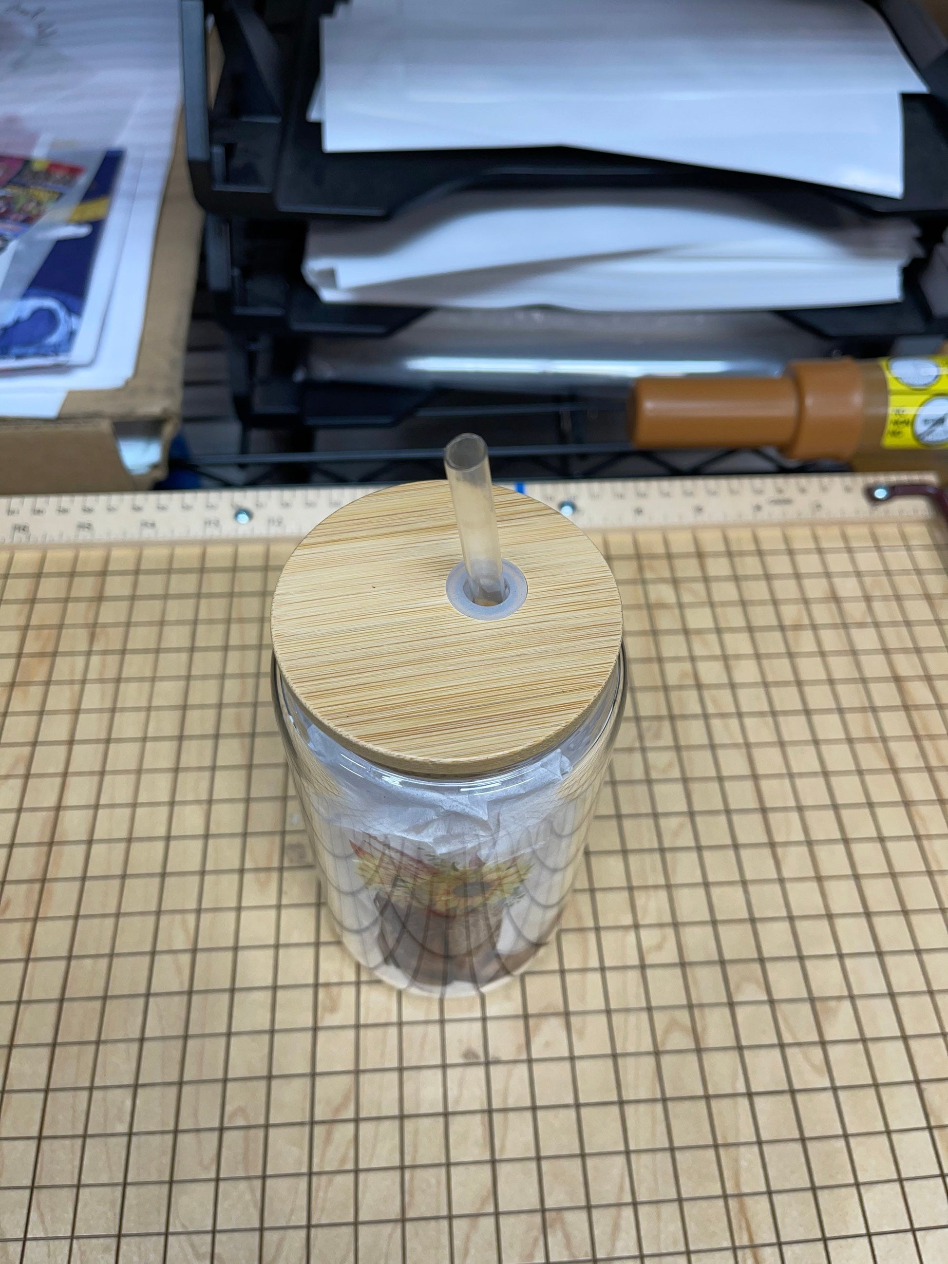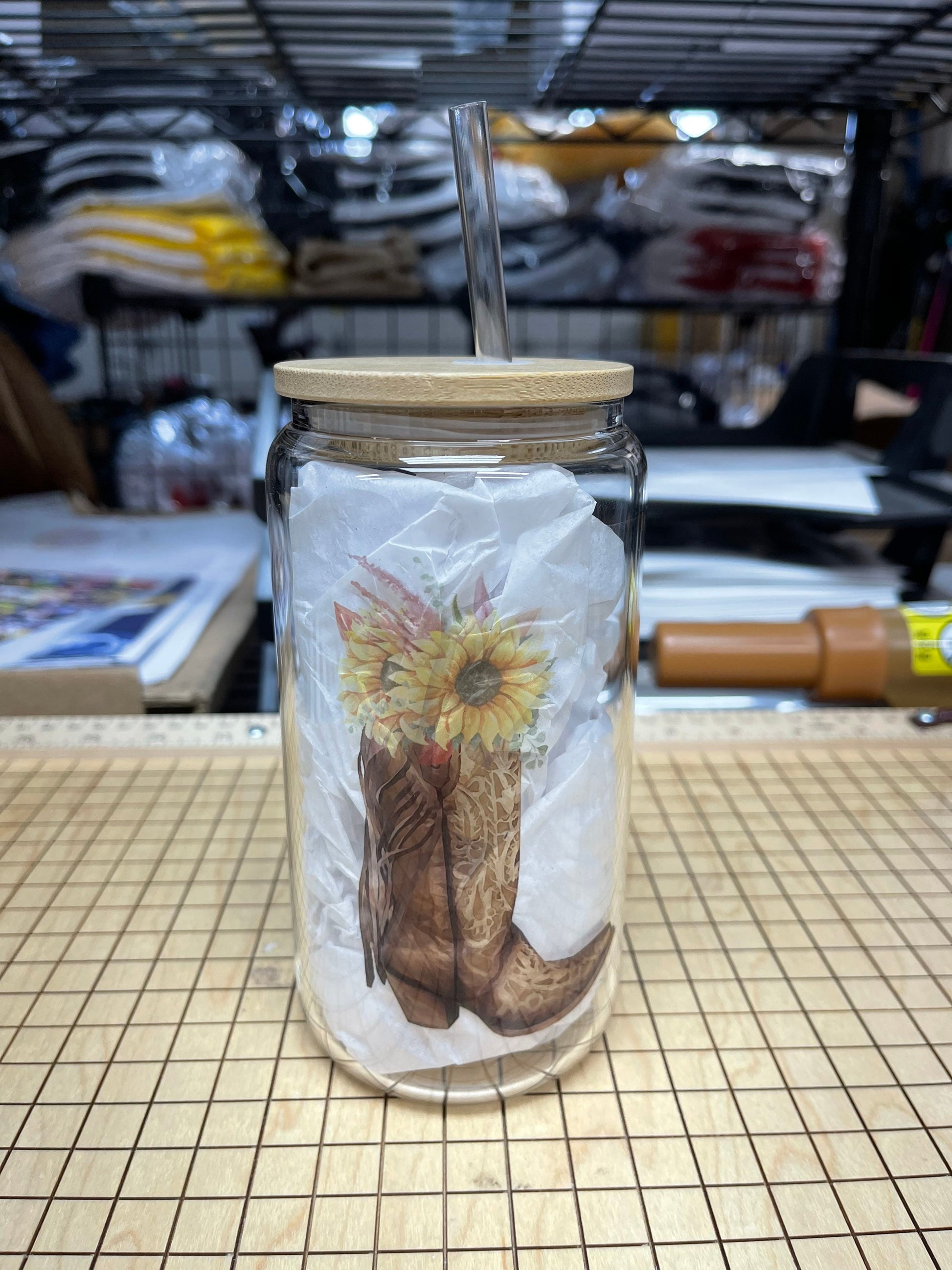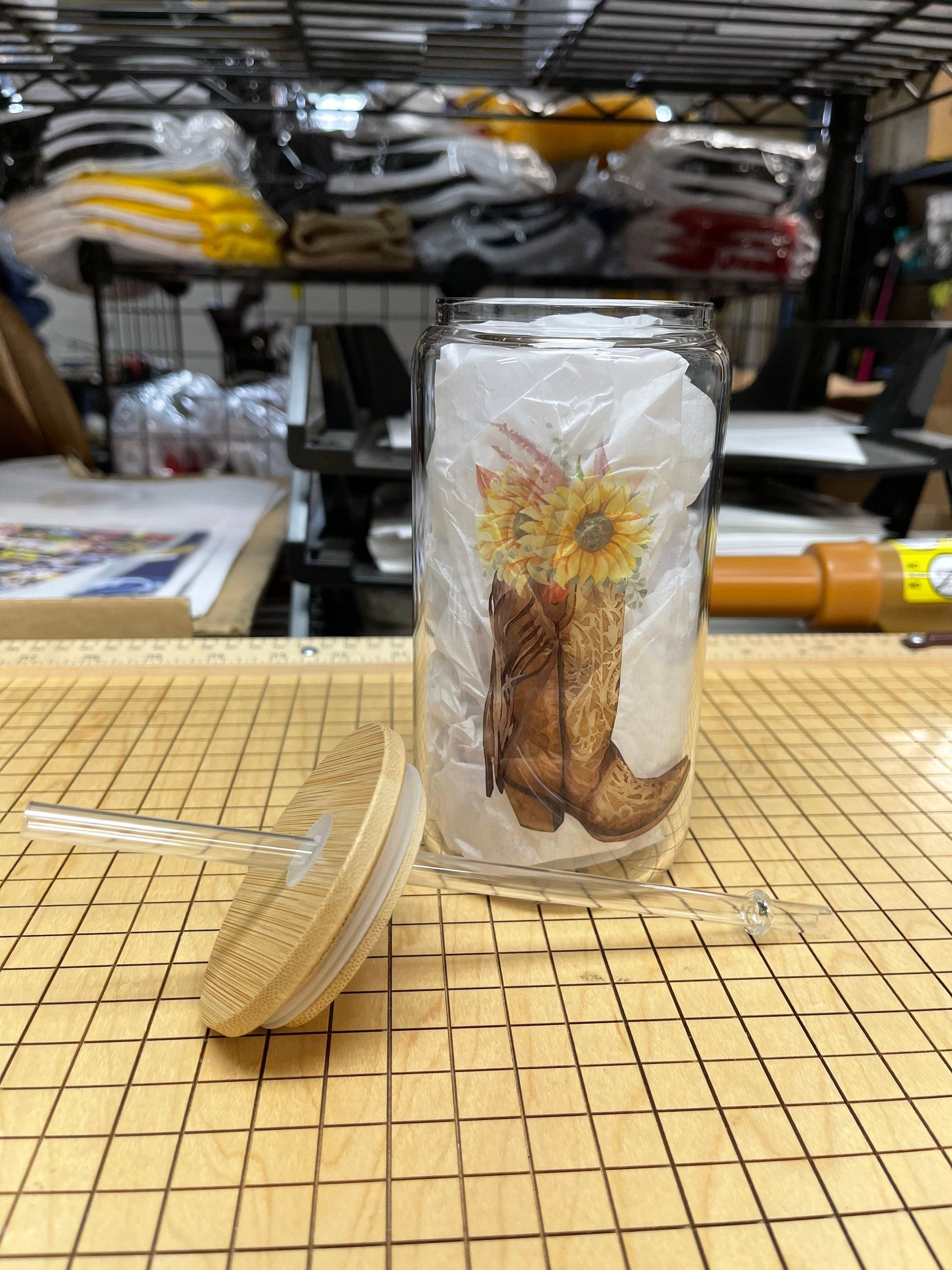 16oz Glass tumbler. Cowgirl boot with sunflowers. Comes with bamboo lid and plastic straw.
