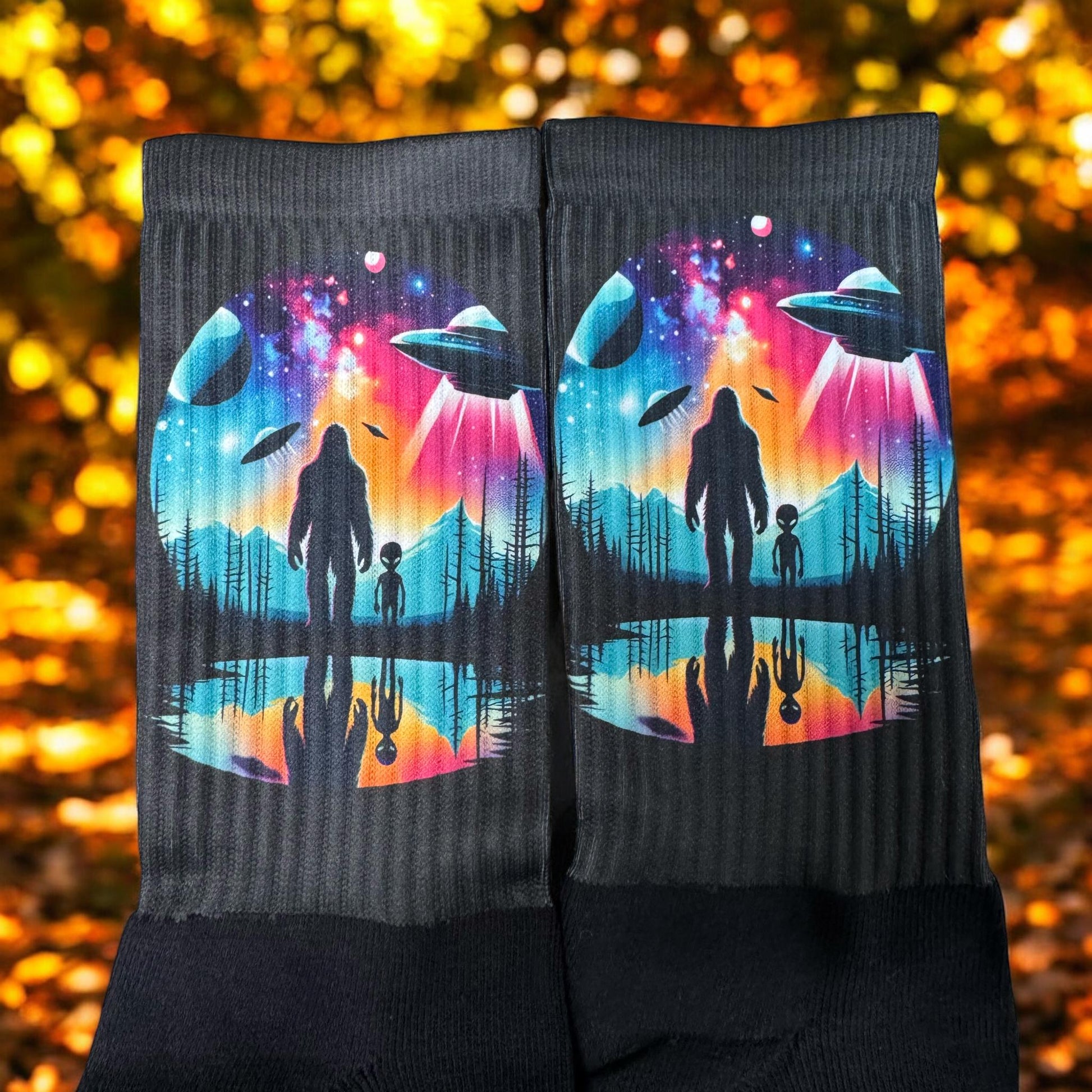 Step into the extraordinary with our Bigfoot and Alien themed crew socks! These colorful and eye-catching socks are a perfect blend of comfort, cushion, and style. Each pair is hand-created and printed right here in the USA, making them the ultimate addition to your sock collection.