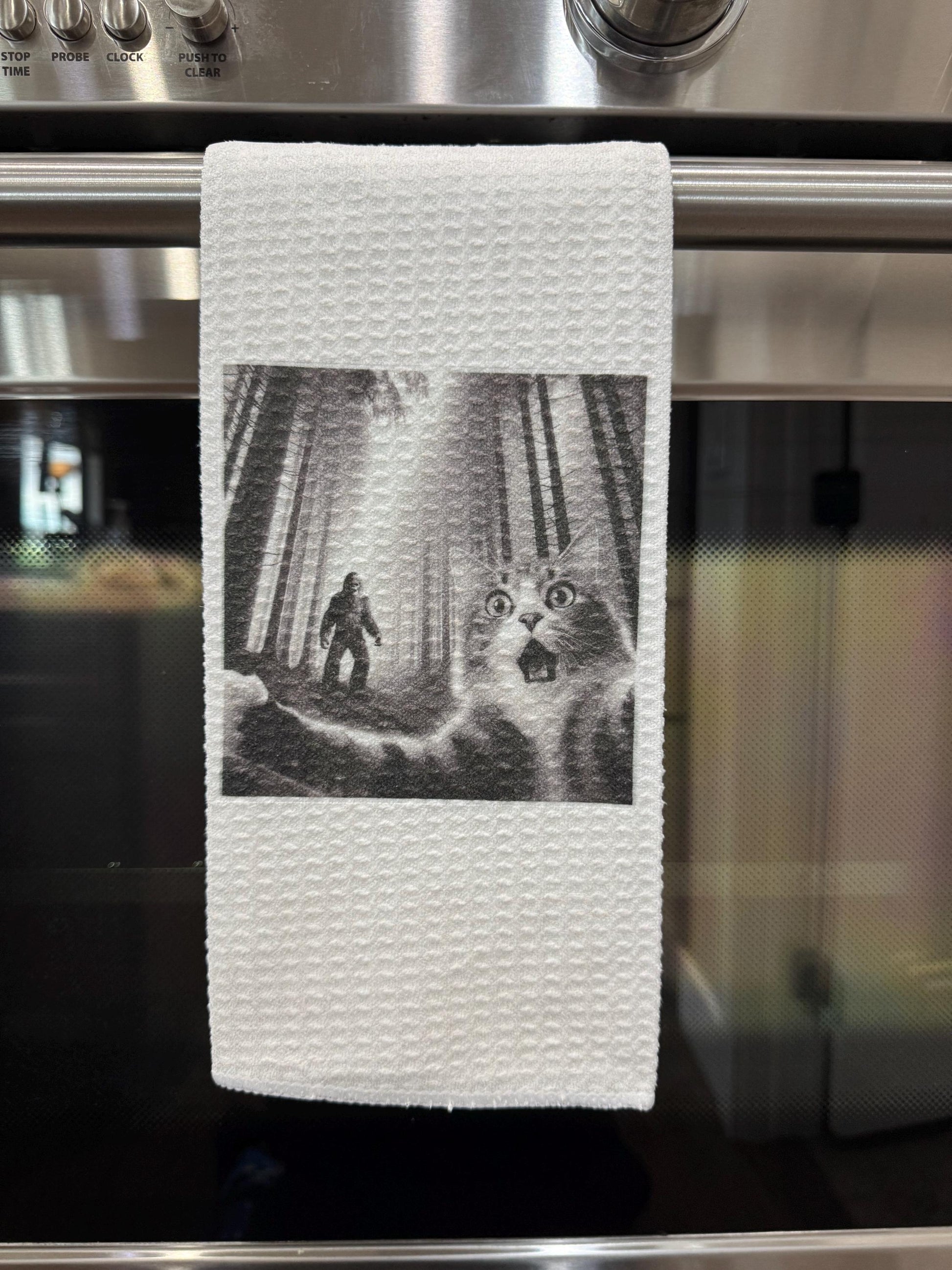 Cat Taking Selfie with Bigfoot Kitchen Towel – Perfect Gift for Animal Lovers and Bigfoot Fans