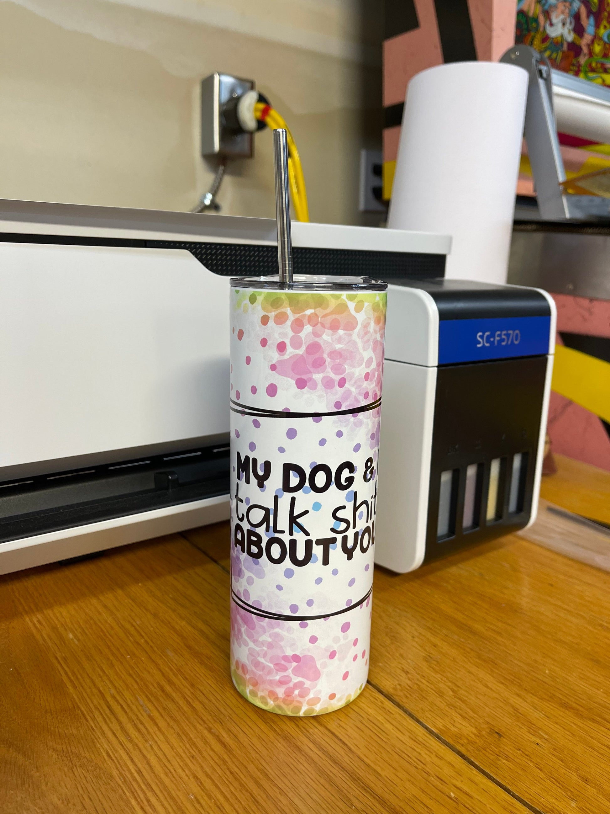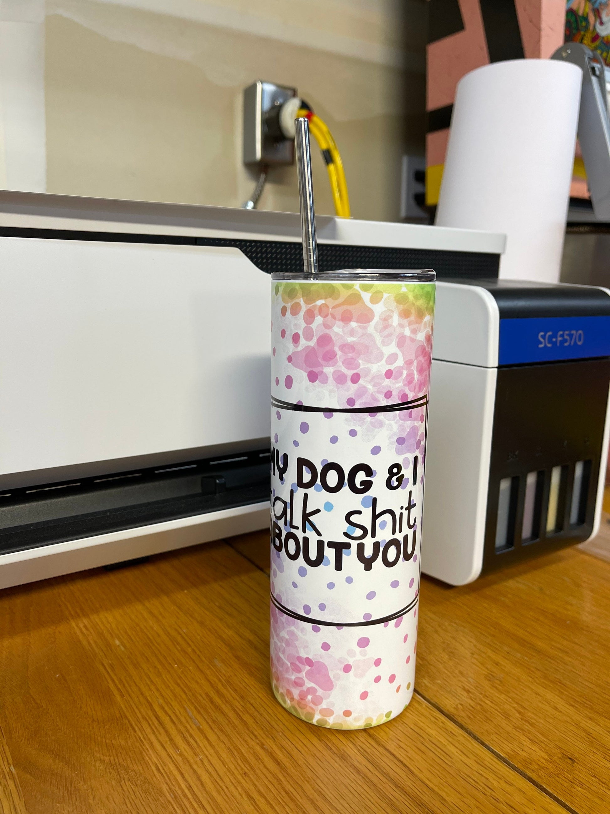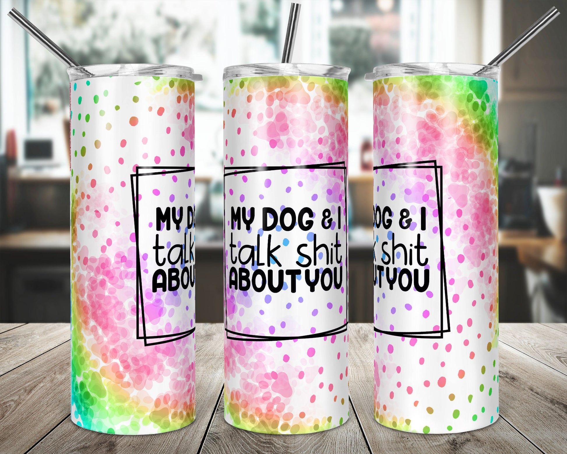 If you and your dog are the ultimate gossip duo, this tumbler is for you! Featuring the sassy phrase "My dog and I talk shit about you,"* it's perfect for dog lovers who enjoy a good laugh while sipping their favorite drink. This travel tumbler combines humor and practicality in one sleek design.