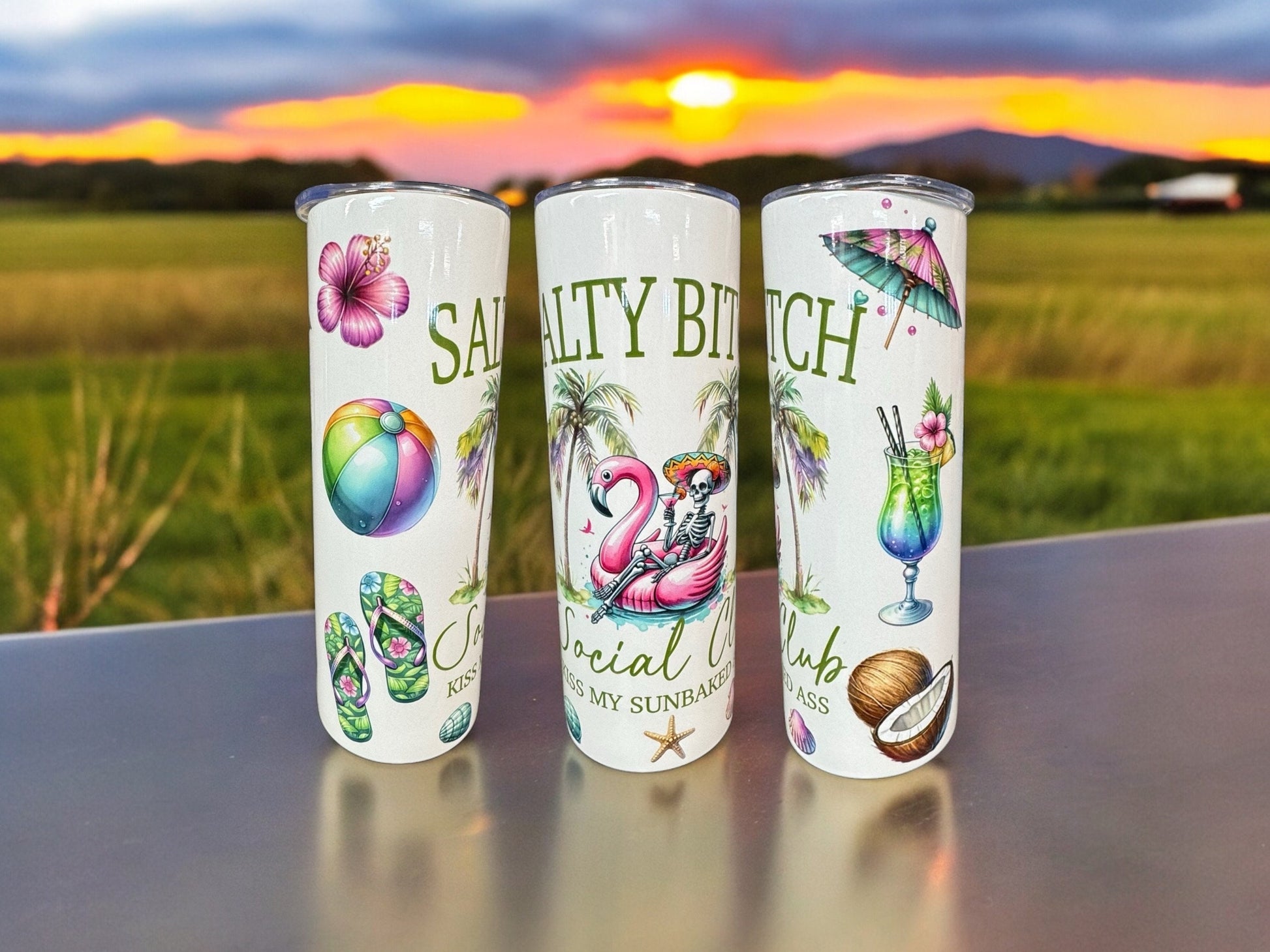 Stay salty, sassy, and unapologetically bold with our "Salty Bitch Social Club" tumbler! Featuring a bold design with the phrase "Kiss My Sunbaked Ass"—this tumbler is perfect for anyone who owns their attitude, loves the sun, and isn't afraid to show it.
